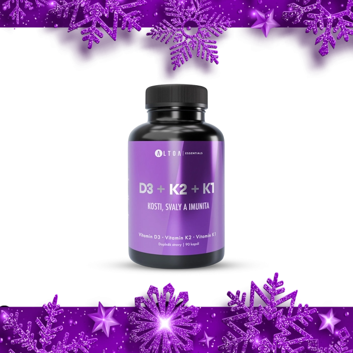 Vitamin D3 je klíčový pro imunitu, pevné kosti a svalovou funkci. Vitamin K2 v biologicky aktivní formě MK-7 pomáhá usměrňovat vápník tam, kde má být – do kostí a zubů. Vitamin K1 doplňuje účinky a podporuje normální srážlivost krve. Společně tvoří vyvážený komplex pro dlouhodobé zdraví a vitalitu.