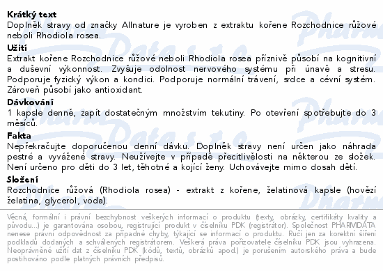 Doplněk stravy od značky Allnature je vyroben z extraktu kořene Rozchodnice růžové neboli Rhodiola rosea.