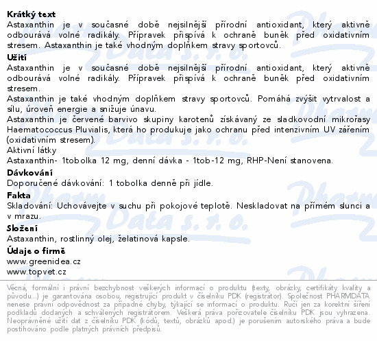 Astaxanthin je v současné době nejsilnější přírodní antioxidant, který aktivně odbourává volné radikály. Přípravek přispívá k ochraně buněk před oxidativním stresem. Astaxanthin je také vhodným doplňkem stravy sportovců.