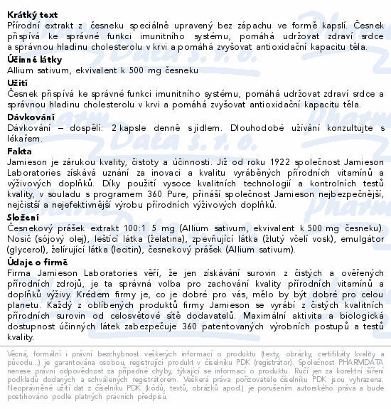 Přírodní extrakt z česneku speciálně upravený bez zápachu ve formě kapslí. Česnek přispívá ke správné funkci imunitního systému, pomáhá udržovat zdraví srdce a správnou hladinu cholesterolu v krvi a pomáhá zvyšovat antioxidační kapacitu těla.