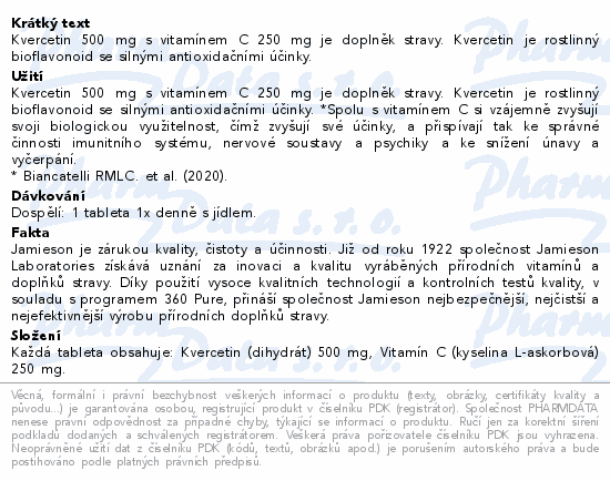 Kvercetin 500 mg s vitamínem C 250 mg je doplněk stravy. Kvercetin je rostlinný bioflavonoid se silnými antioxidačními účinky.