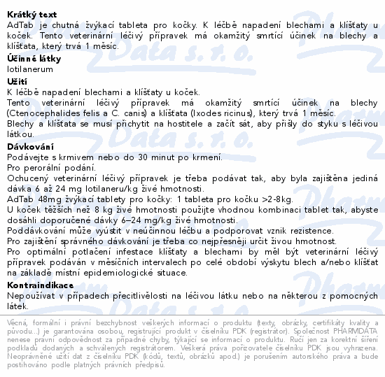 AdTab je chutná žvýkací tableta pro kočky. K léčbě napadení blechami a klíšťaty u koček. Tento veterinární léčivý přípravek má okamžitý smrtící účinek na blechy a klíšťata, který trvá 1 měsíc.