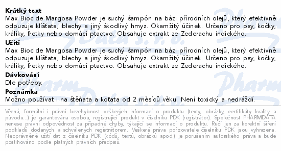 Max Biocide Margosa Powder je suchý šampón na bázi přírodních olejů, který efektivně odpuzuje klíšťata, blechy a jiný škodlivý hmyz. Okamžitý účinek. Určeno pro psy, kočky, králíky, fretky nebo domácí ptactvo. Obsahuje extrakt ze Zederachu indického.