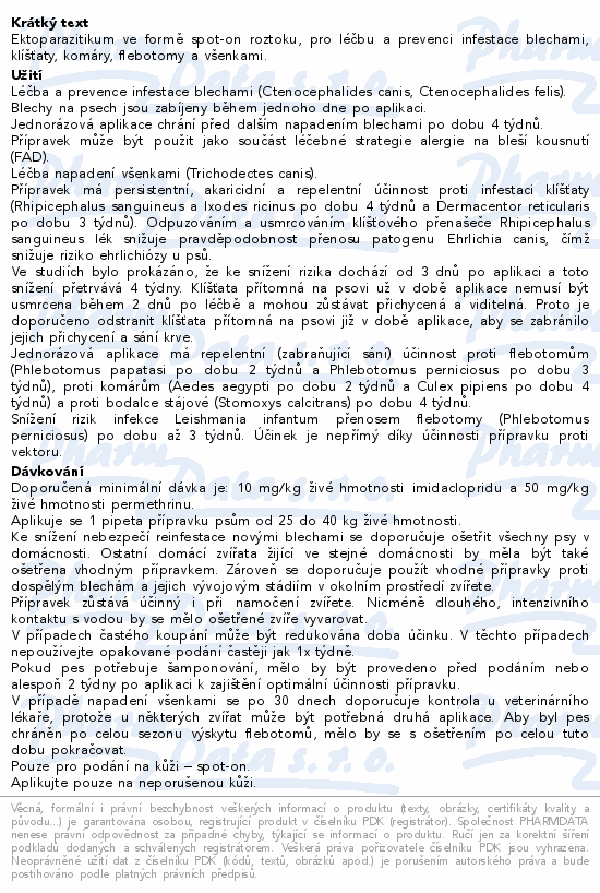 Ektoparazitikum ve formě spot-on roztoku, pro léčbu a prevenci infestace blechami, klíšťaty, komáry, flebotomy a všenkami.