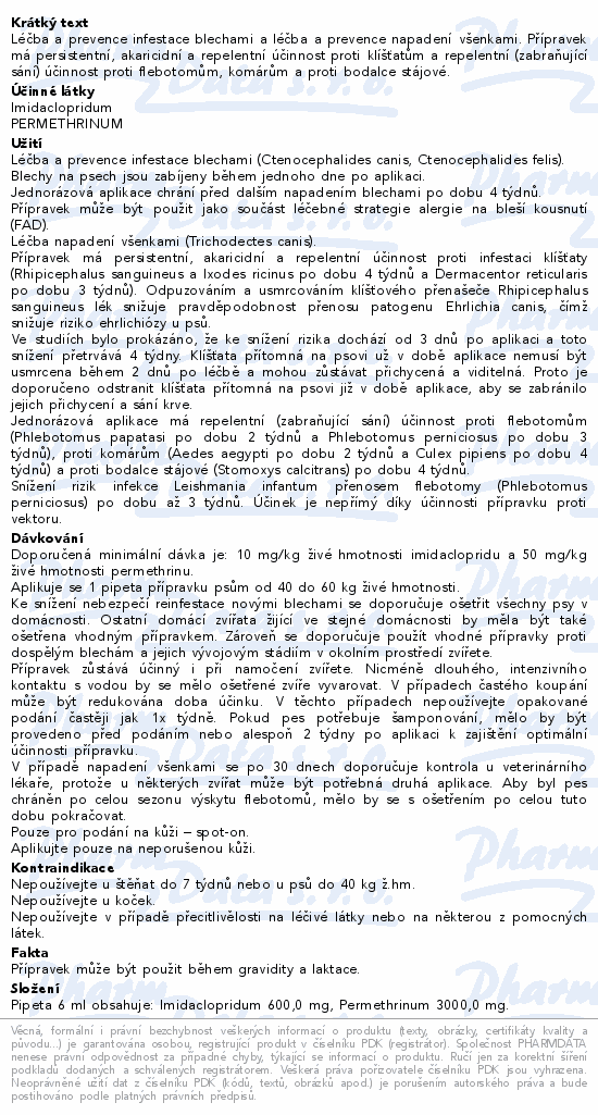 Léčba a prevence infestace blechami a léčba a prevence napadení všenkami. Přípravek má persistentní, akaricidní a repelentní účinnost proti klíšťatům a repelentní (zabraňující sání) účinnost proti flebotomům, komárům a proti bodalce stájové.