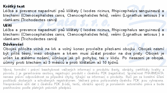 Léčba a prevence napadnutí psů klíšťaty ( Ixodes ricinus, Rhipicephalus sanguineus) a blechami (Ctenocephalides canis, Ctenocephalides felis), vešmi (Lignathus setosus ) a všenkami (Trichodectes canis).