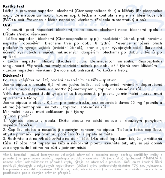 Léčba a prevence napadení blechami (Ctenocephalides felis) a klíšťaty (Rhipicephalus spp., Dermatocentor spp., Ixodes spp.), léčba a kontrola alergie na bleší kousnutí (FAD) u psů. Prevence a léčba napadení všenkami (Felicola subrostratus) u psů.