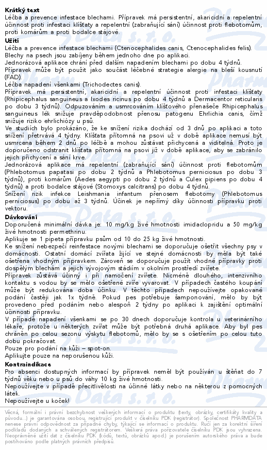 Léčba a prevence infestace blechami. Přípravek má persistentní, akaricidní a repelentní účinnost proti infestaci klíšťaty a repelentní (zabraňující sání) účinnost proti flebotomům, proti komárům a proti bodalce stájové.