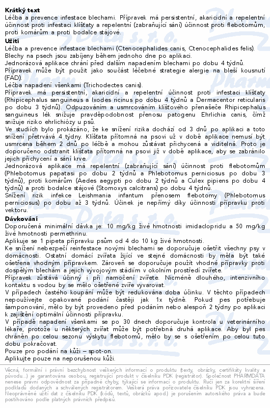Léčba a prevence infestace blechami. Přípravek má persistentní, akaricidní a repelentní účinnost proti infestaci klíšťaty a repelentní (zabraňující sání) účinnost proti flebotomům, proti komárům a proti bodalce stájové.