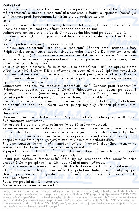 Léčba a prevence infestace blechami a léčba a prevence napadení všenkami. Přípravek má persistentní, akaricidní a repelentní účinnost proti klíšťatům a repelentní (zabraňující sání) účinnost proti flebotomům, komárům a proti bodalce stájové.