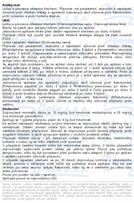 Léčba a prevence infestace blechami. Přípravek má persistentní, akaricidní a repelentní účinnost proti infestaci klíšťaty a repelentní (zabraňující sání) účinnost proti flebotomům, proti komárům a proti bodalce stájové.
