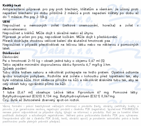 Antiparazitární přípravek pro psy proti blechám, klíšťatům a všenkám. Je účinný proti napadení blechami po dobu přibližně 2 měsíců a proti napadení klíšťaty po dobu až do 1 měsíce. Pro psy 2-10kg.