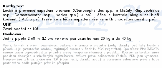 Léčba a prevence napadení blechami (Ctenocephalides spp.) a klíšťaty (Rhipicephalus spp., Dermatocentor spp., Ixodes spp.) u psů. Léčba a kontrola alergie na bleší kousnutí (FAD) u psů. Prevence a léčba napadení všenkami (Trichodectes canis) u psů.