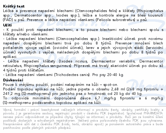 Léčba a prevence napadení blechami (Ctenocephalides felis) a klíšťaty (Rhipicephalus spp., Dermatocentor spp., Ixodes spp.), léčba a kontrola alergie na bleší kousnutí (FAD) u psů. Prevence a léčba napadení všenkami (Felicola subrostratus) u psů.