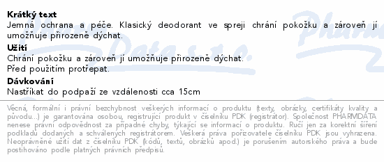 Jemná ochrana a péče. Klasický deodorant ve spreji chrání pokožku a zároveň jí umožňuje přirozeně dýchat.