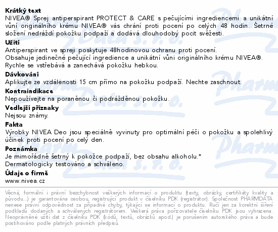 NIVEA® Sprej antiperspirant PROTECT & CARE s pečujícími ingrediencemi a unikátní vůní originálního krému NIVEA® vás chrání proti pocení po celých 48 hodin. Šetrné složení nedráždí pokožku podpaží a dodává dlouhodobý pocit svěžesti.