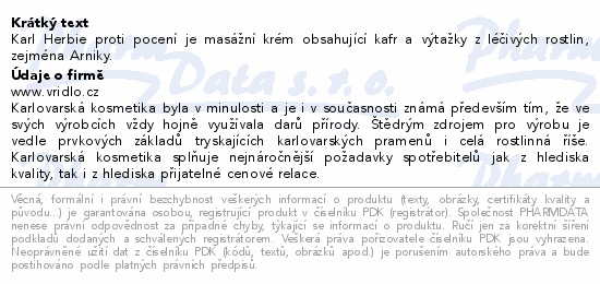 Karl Herbie proti pocení je masážní krém obsahující kafr a výtažky z léčivých rostlin, zejména Arniky.