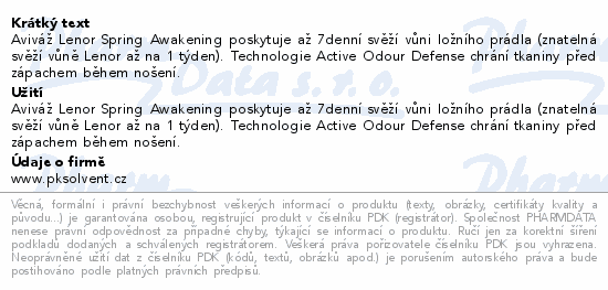 Aviváž Lenor Spring Awakening poskytuje až 7denní svěží vůni ložního prádla (znatelná svěží vůně Lenor až na 1 týden). Technologie Active Odour Defense chrání tkaniny před zápachem během nošení.