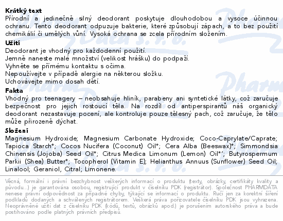 Přírodní a jedinečně silný deodorant poskytuje dlouhodobou a vysoce účinnou ochranu. Tento deodorant odpuzuje bakterie, které způsobují zápach, a to bez použití chemikálií či umělých vůní. Vysoká ochrana se zcela přírodním složením.