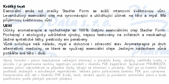Esenciální směs od značky Stadler Form se svěží intenzivní květinovou vůni. Levandulový esenciální olej má vyrovnávající a uklidňující účinek na tělo a mysl. Má příjemnou květinovou vůni.