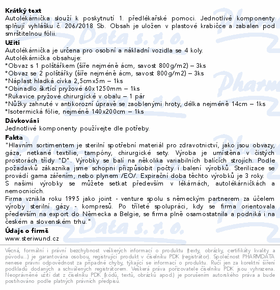 Autolékárnička slouží k poskytnutí 1. předlékařské pomoci. Jednotlivé komponenty splňují vyhlášku č. 206/2018 Sb. Obsah je uložen v plastové krabičce a zabalen pod smrštitelnou fólii.