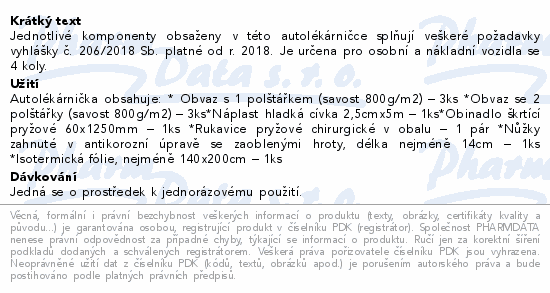 Jednotlivé komponenty obsaženy v této autolékárničce splňují veškeré požadavky vyhlášky č. 206/2018 Sb. platné od r. 2018. Je určena pro osobní a nákladní vozidla se 4 koly.