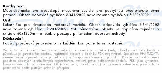 Motolékárnička pro dvoustopá motorová vozidla pro poskytnutí předlékařské první pomoci. Obsah odpovídá vyhlášce č.341/2002 novelizované vyhláškou č.283/2009.