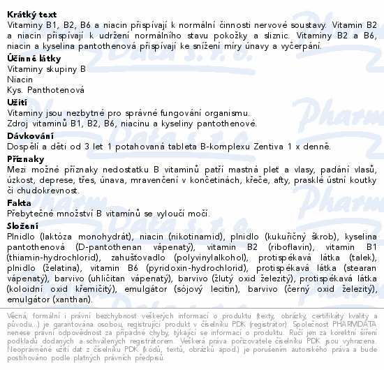 B-Komplex Zentiva je doplněk stravy obsahující vyváženou kombinaci vitaminů skupiny B, které společně podporují řadu klíčových funkcí v organismu - normální činnost nervové soustavy, pokožky a sliznic a snížení míry únavy a vyčerpání.