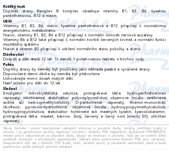 Doplněk stravy Beviplex B komplex obsahuje vitamíny B1, B2, B6, kyselinu pantothenovou, B12 a niacin.