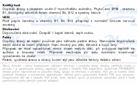 Doplněk stravy s obsahem uridin-5'-monofosfátu sodného, PhytoCann BP® , vitaminu B1, biologicky aktivních forem vitaminů B6, B12 a kyseliny listové.