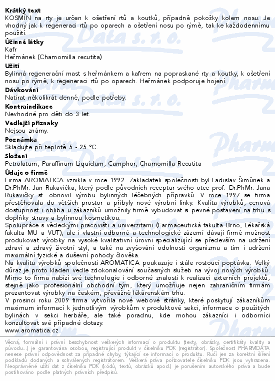 KOSMÍN na rty je určen k ošetření rtů a koutků, případně pokožky kolem nosu. Je vhodný jak k regeneraci rtů po oparech a ošetření nosu po rýmě, tak ke každodennímu použití.