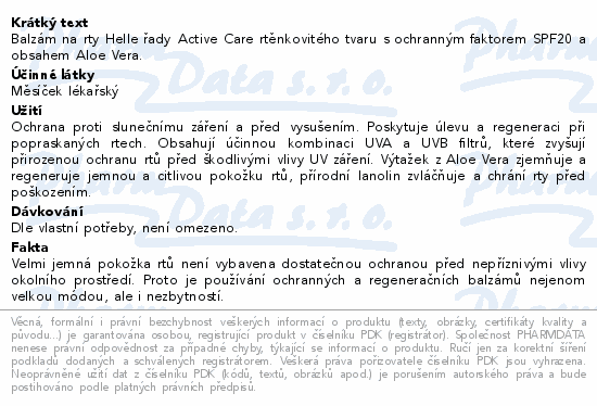 Balzám na rty Helle řady Active Care rtěnkovitého tvaru s ochranným faktorem SPF20 a obsahem Aloe Vera.
