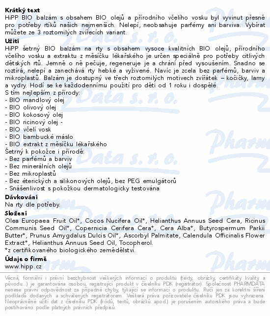 HiPP BIO balzám s obsahem BIO olejů a přírodního včelího vosku byl vyvinut přesně pro potřeby rtíků našich nejmenších. Nelepí, neobsahuje parfémy ani barviva. Vybírat můžete ze 3 roztomilých zvířecích variant.
