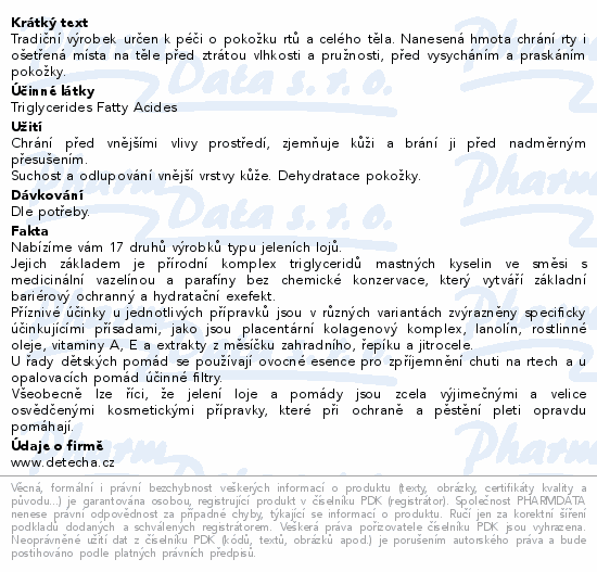 Tradiční výrobek určen k péči o pokožku rtů a celého těla. Nanesená hmota chrání rty i ošetřená místa na těle před ztrátou vlhkosti a pružnosti, před vysycháním a praskáním pokožky.