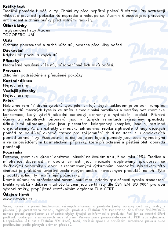 Tradiční pomáda k péči o rty. Chrání rty před nepřízní počasí či větrem. Rty neztrácejí vlhkost a pružnost, pokožka rtů nepraská a neloupe se. Vitamin E působí jako přirozený antioxidant a chrání buňky před volnými radikály.