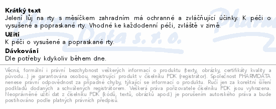 Jelení lůj na rty s měsíčkem zahradním má ochranné a zvláčňující účinky. K péči o vysušené a popraskané rty. Vhodné ke každodenní péči, zvláště v zimě.