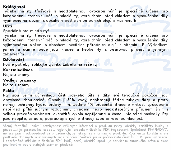 Tyčinka na rty třešňová s neodolatelnou ovocnou vůní je speciálně určena pro každodenní intenzivní péči o mladé rty, které chrání před chladem a vysoušením díky výjimečnému složení s obsahem pěsticích přírodních olejů a vitaminu E.