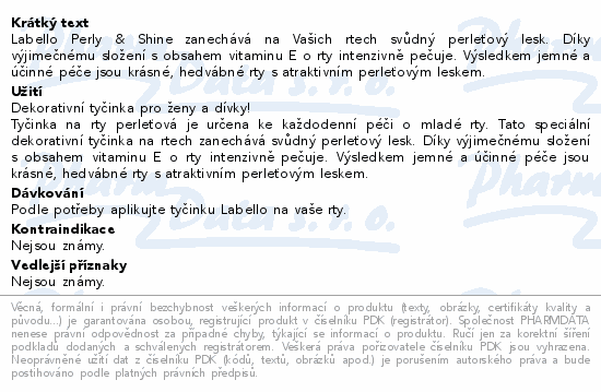 Labello Perly & Shine zanechává na Vašich rtech svůdný perleťový lesk. Díky výjimečnému složení s obsahem vitaminu E o rty intenzivně pečuje. Výsledkem jemné a účinné péče jsou krásné, hedvábné rty s atraktivním perleťovým leskem.
