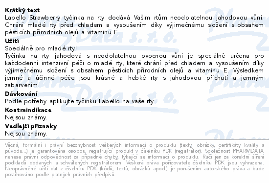 Labello Strawberry tyčinka na rty dodává Vašim rtům neodolatelnou jahodovou vůni. Chrání mladé rty před chladem a vysoušením díky výjimečnému složení s obsahem pěsticích přírodních olejů a vitaminu E.