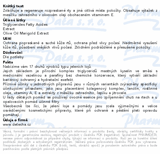 Zvláčňuje a regeneruje rozpraskané rty a jiná citlivá místa pokožky. Obsahuje výtažek z mesíčku zahradního v olivovém oleji obohaceném vitaminem E.