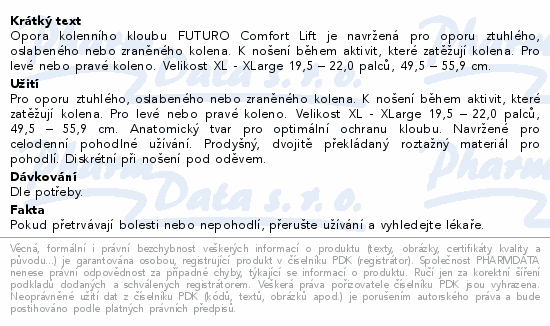 Opora kolenního kloubu FUTURO Comfort Lift je navržená pro oporu ztuhlého, oslabeného nebo zraněného kolena. K nošení během aktivit, které zatěžují kolena. Pro levé nebo pravé koleno. Velikost XL - XLarge 19,5 – 22,0 palců, 49,5 – 55,9 cm.
