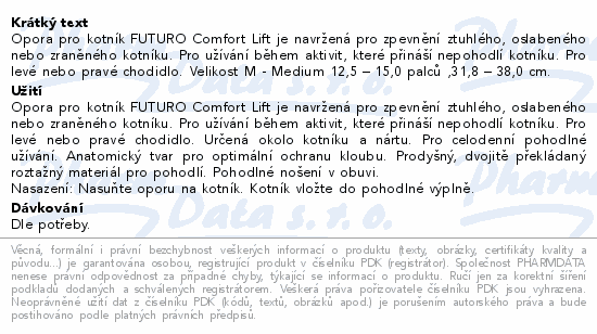 Opora pro kotník FUTURO Comfort Lift je navržená pro zpevnění ztuhlého, oslabeného nebo zraněného kotníku. Pro užívání během aktivit, které přináší nepohodlí kotníku. Pro levé nebo pravé chodidlo. Velikost M - Medium 12,5 – 15,0 palců ,31,8 – 38,0 cm.