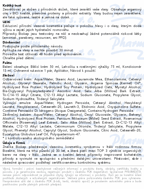 Zesvětlovač je složen z přírodních složek, které zesvětlí vaše vlasy. Obsahuje arganový olej v BIO kvalitě, pšeničné proteiny a přírodní extrakty. Vlasy budou nejen zesvětlené, ale také vyživené, lesklé a jemné na dotek.