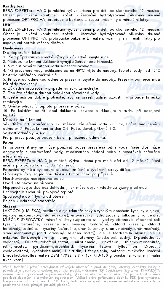 BEBA EXPERTpro HA 3 je mléčná výživa určena pro děti od ukončeného 12. měsíce. Obsahuje unikátní kombinaci složek - částečně hydrolyzované bílkoviny získané procesem OPTIPRO HA, probiotické bakterie L. reuteri, vitamíny a minerální látky.