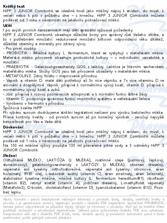 HiPP 3 JUNIOR Combiotik se ideálně hodí jako mléčný nápoj k snídani, do müsli, k večeři nebo k pití v průběhu dne – z hrnečku. HiPP 3 JUNIOR Combiotik můžete podávat od 1 roku v návaznosti na jakékoliv pokračovací mléko.