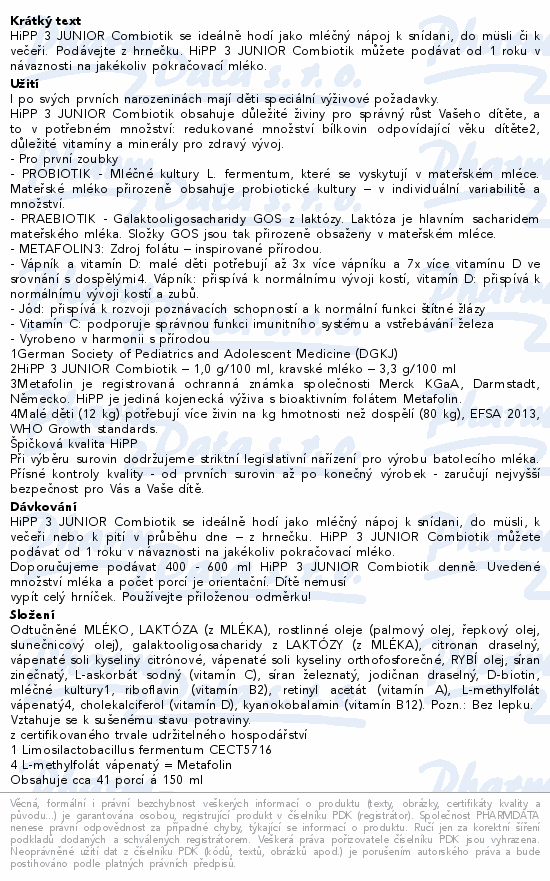 HiPP 3 JUNIOR Combiotik se ideálně hodí jako mléčný nápoj k snídani, do müsli či k večeři. Podávejte z hrnečku. HiPP 3 JUNIOR Combiotik můžete podávat od 1 roku v návaznosti na jakékoliv pokračovací mléko.