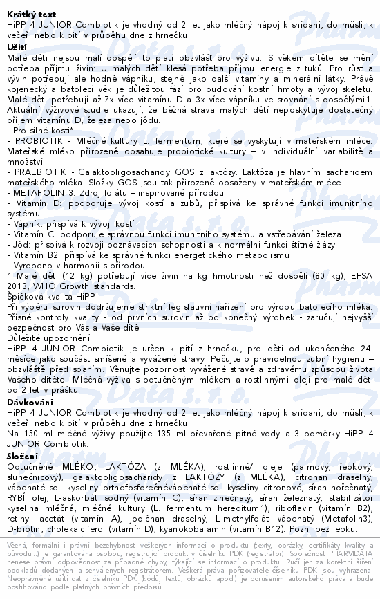 HiPP 4 JUNIOR Combiotik je vhodný od 2 let jako mléčný nápoj k snídani, do müsli, k večeři nebo k pití v průběhu dne z hrnečku.