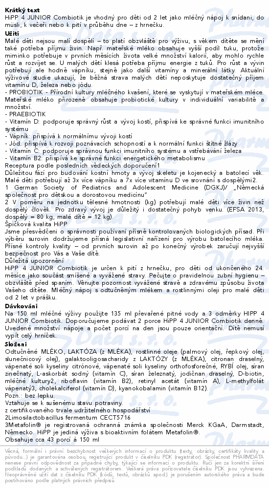HiPP 4 JUNIOR Combiotik je vhodný pro děti od 2 let jako mléčný nápoj k snídani, do müsli, k večeři nebo k pití v průběhu dne – z hrnečku.