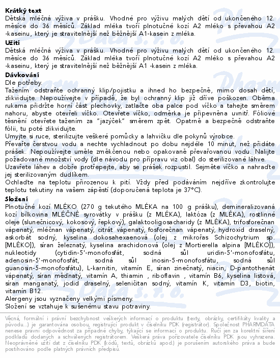 Dětská mléčná výživa v prášku. Vhodné pro výživu malých dětí od ukončeného 12. měsíce do 36 měsíců. Základ mléka tvoří plnotučné kozí A2 mléko s převahou A2 -kaseinu, který je stravitelnější než běžnější A1-kasein z mléka.
