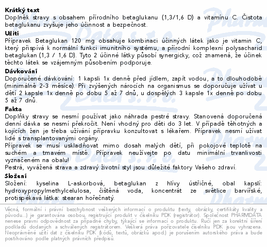 Doplněk stravy s obsahem přírodního betaglukanu (1,3/1,6 D) a vitamínu C. Čistota betaglukanu zvyšuje jeho účinnost a bezpečnost.